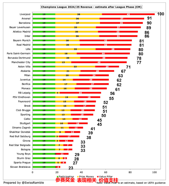 通过对各项奖金的逐项估算,我们发现利物浦在本赛季获得了高达1亿欧元的奖金,成为奖金榜上的第一名。而总体来看,新赛制下的奖金分配相对更为公平和竞技导向。