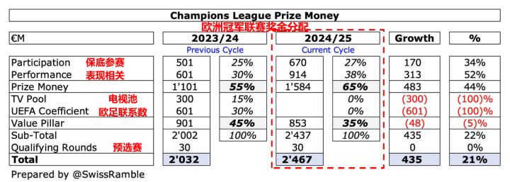 24/25赛季欧冠奖金分配机制解析